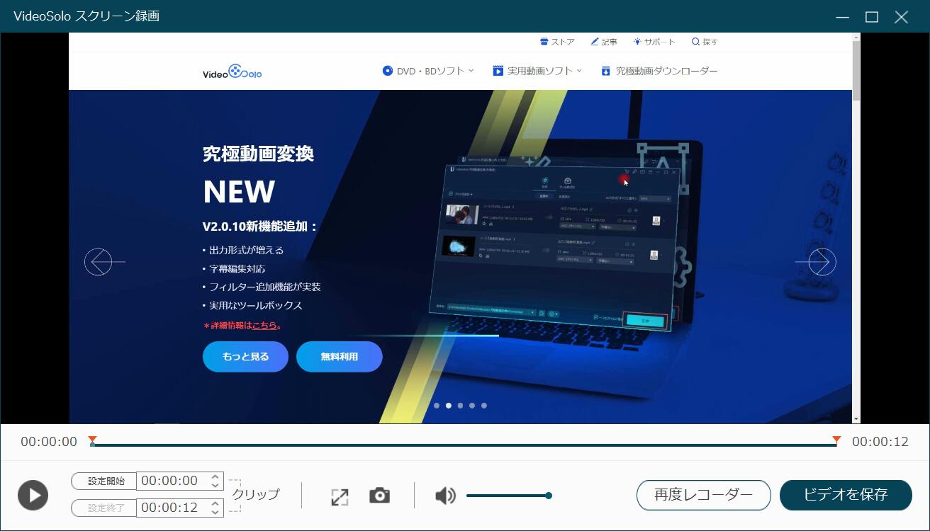 動画をダウンロードできなくても、強力な動画レコーダーでビデオ画面を録画し、パソコンに出力して保存することができます。ここでは 「VideoSolo スクリーン録画 」 を例にして、JW Playerの動画を録画するやり方について紹介します。